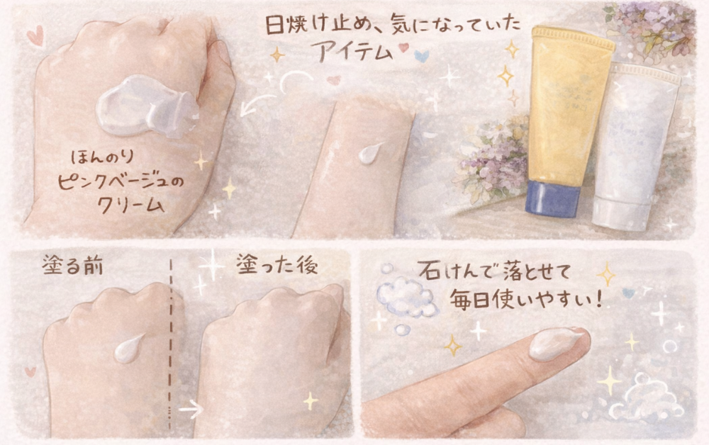 このアイテムは日焼け止めとしてだけでなく、化粧下地としても活用できます。うすいピンクベージュカラーがついているため、肌を明るい印象に見せたいときにも便利です。ファンデーションの前に塗ることで、肌表面をなめらかに整え、メイクのノリをサポートしてくれます。カバー力を強くうたう商品ではありませんが、自然なトーンアップを求める方には使いやすいでしょう。厚く塗りすぎると白っぽく見えることがあるため、少量ずつなじませるのがポイントです。日焼け止めと下地を兼ねたい人にとって、工程を減らせる点はうれしいメリットといえます。忙しい朝にも取り入れやすいアイテムです。