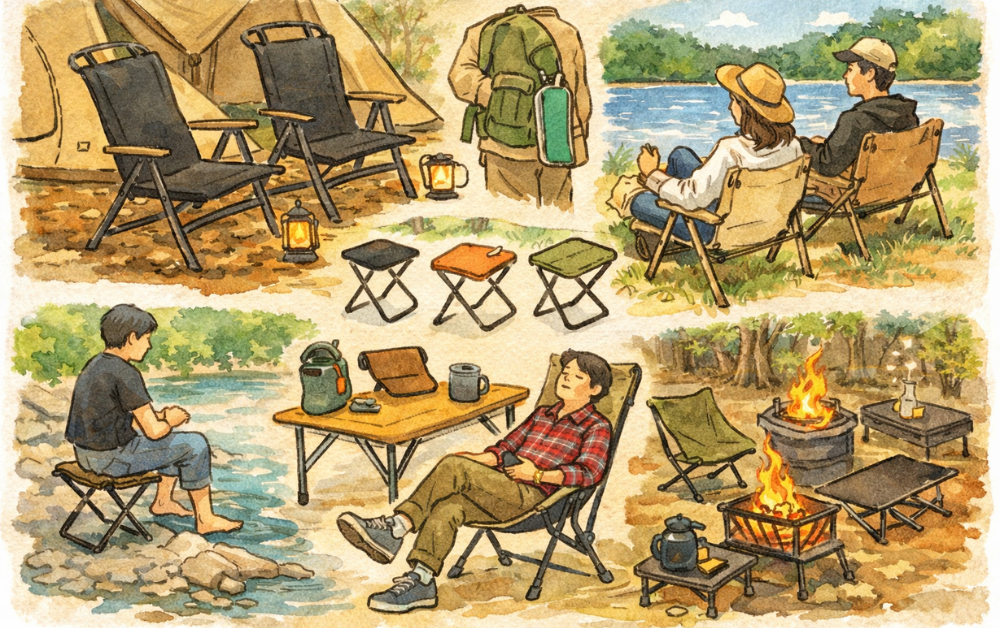 同じコンパクトチェアでも、向いている場面はそれぞれ異なります。キャンプで使いやすいものと、登山やフェスで便利なものでは重視したいポイントが変わるからです。使う場所や過ごし方を先に考えておくと、必要な機能がはっきりします。ここでは代表的な用途ごとに、選ぶコツを分かりやすく整理します。
